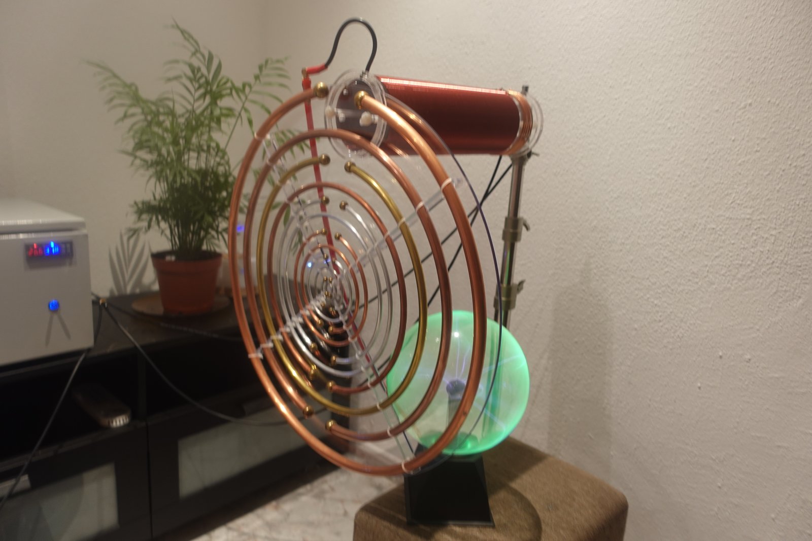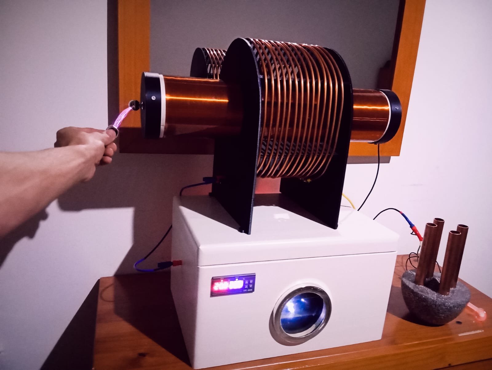 Es un sistema físico de oscilación real, basado en chispas, bobinas, plasma y antenas resonantes, capaz de producir un campo multifrecuencia continuo, rico en armónicos y subarmónicos naturales.